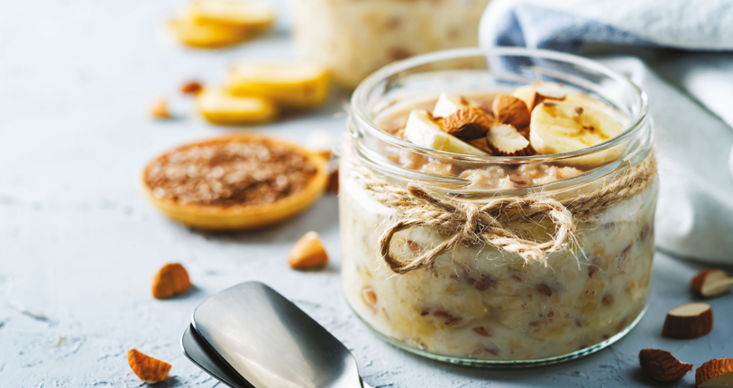 Almond butter’s protein content supports muscle repair, hair and nail health, and promotes satiety, helping weight management. Its healthy fats, fibre, vitamins and minerals like magnesium and calcium, boost heart health, control blood sugar, improve brain function, and provide sustained energy. Bananas contribute to muscle repair and can support post-workout recovery when combined with other protein sources. Oats are a good source of plant-based protein, improving fullness.